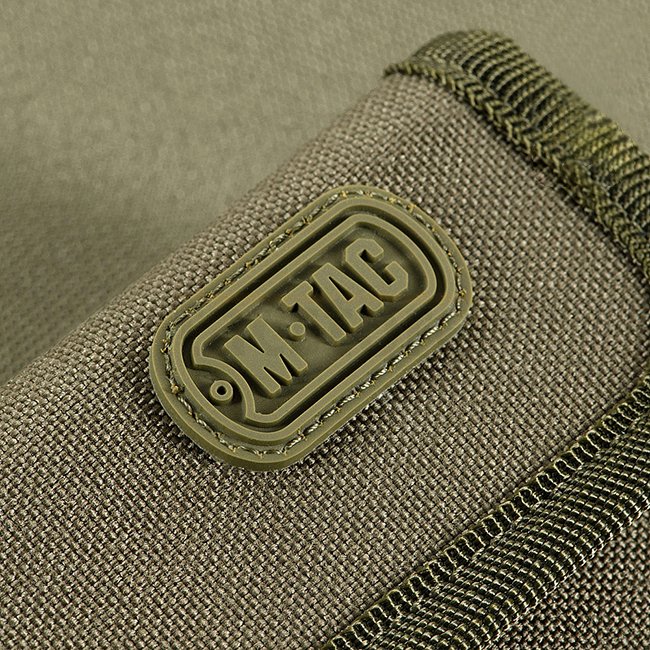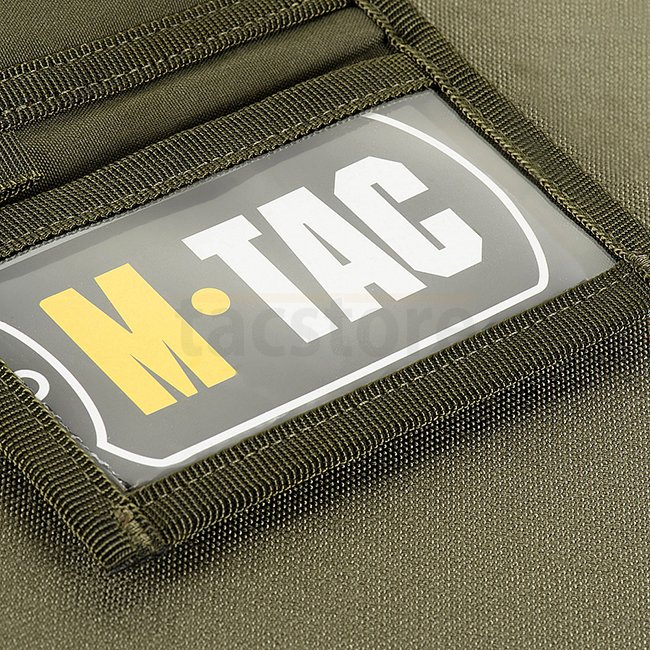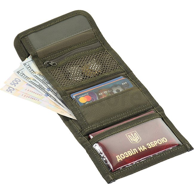 Es hat zwei große Fächer für Geldscheine, Fächer für Karten und Kunststofffächer für Dokumente. Es gibt auch eine Kleingeldtasche, die mit einem Reißverschluss geschlossen wird. Auf der Vorderseite mit Klett können Sie verschiedene Patches anbringen.