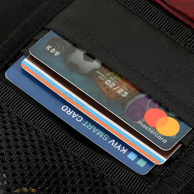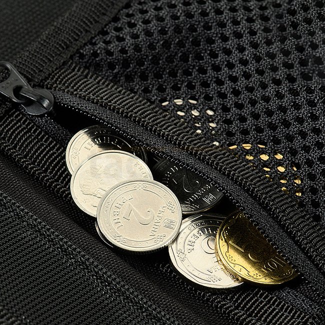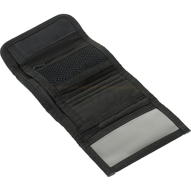 Es hat zwei große Fächer für Geldscheine, Fächer für Karten und Kunststofffächer für Dokumente. Es gibt auch eine Kleingeldtasche, die mit einem Reißverschluss geschlossen wird. Auf der Vorderseite mit Klett können Sie verschiedene Patches anbringen.