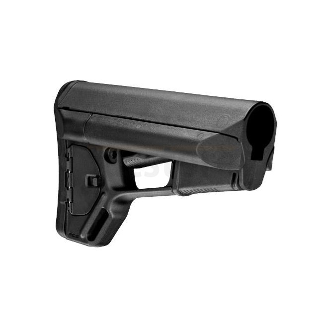 Das patentierte Magpul ACS (Adaptable Carbine / Storage) Mil-Spec Modell ist ein direkter Ersatz für den AR15 / M16 Carbine Schaft mit Mil-Spec Rohr Abmessungen. Das schlanke Profil verhindert ein Hängenbleiben und schützt den Entriegelungshebel gegen ungewolltes Betätigen. Ähnlich wie beim Magpul CTR kommt auch beim ACS ein zusätzliches Friction Lock System zur Anwendung welches für mehr Halt und dadurch Präzision sorgt. Beidseitige, von hinten zugängliche und wasserresistente Batterieröhren sowie ein seitliches Fach bieten zahlreiche Aufnahmeoptionen für Zubehör. Der ACS ist standardmässig mit einem 0.30 Inch dicken Gummischaft-Pad ausgestattet, welches für den nötigen Halt der Waffe im Anschlag sorgt, selbst in Verbindung mit einer Weste.