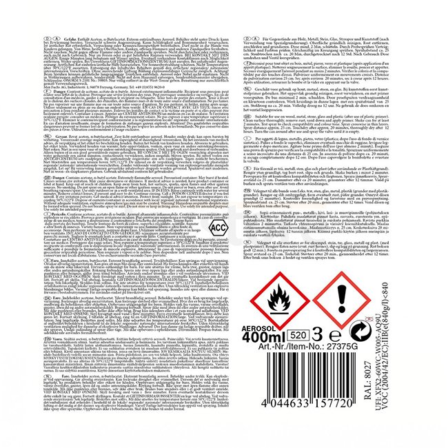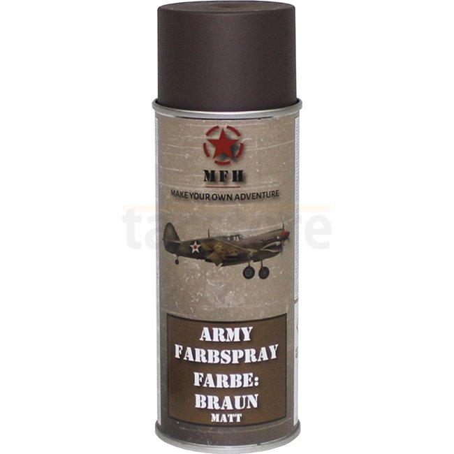 MFH Army Sprühfarbe 400 ml in Braun. Nitrokombinationsharzlack für Metall, Holz, Stein, Glas, Styropor und Kunststoff. Schnelltrocknend in 20 Minuten, vollständig trocken in 12 Stunden. RAL8027 Farbcode. Maximal 60 Stück pro Bestellung. Enthält Aceton und