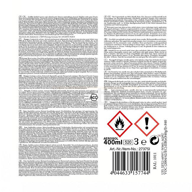 Nitrokombinationsharzlack für Metall, Holz, Stein, Glas, Styropor und Kunststoff. Schnelltrocknend in etwa 20 Minuten, vollständig trocken in 12 Stunden. RAL1011 Farbe. Maximale Kaufmenge pro Bestellung sind 60 Stück. Enthält Aceton und n-Butylacetat.