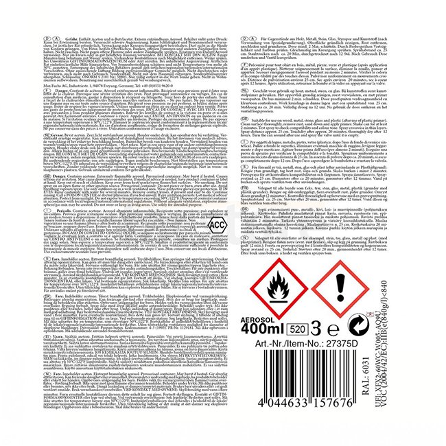 Nitrokombinationsharzlack für Metall, Holz, Stein, Glas, Styropor und Kunststoff. Trocknet staubtrocken in etwa 20 Minuten und vollständig trocken in etwa 12 Stunden. RAL6031 Farbe. Maximale Bestellmenge: 60 Stück. Enthält Aceton und n-Butylacetat.