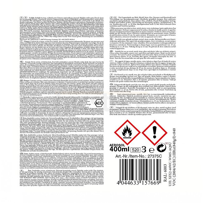 Nitrokombinationsharzlack für Metall, Holz, Stein, Glas, Styropor und Kunststoff. Staubaustrocknung in ca. 20 min, vollständig trocken in ca. 12 h. RAL6003. Maximale Kaufmenge pro Bestellung = 60 Stück. Enthält Aceton und n-Butylacetat.
