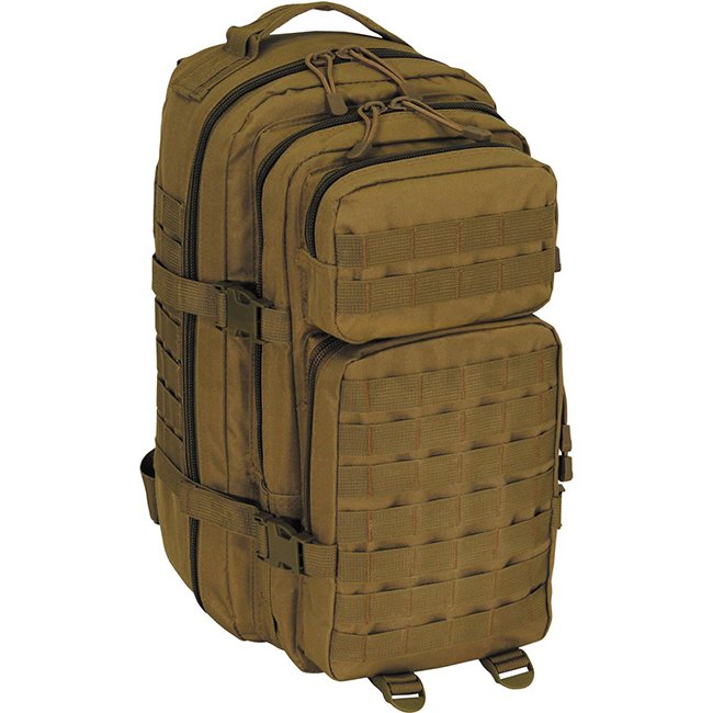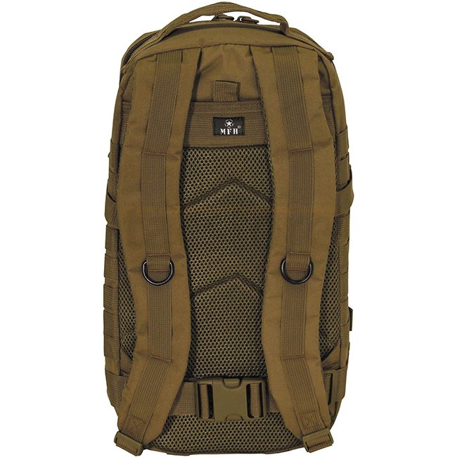 MFH Rucksack Assault 1 Basic - Coyote: Verstellbare, gepolsterte Schultergurte, abnehmbarer Hüftgurt, Fach für Trinksystem, atmungsaktive Mesh-Polsterungen, mehrere Fächer und Taschen, Molle-Befestigungsschlaufen, 30 l Fassungsvermögen. Polyester Material