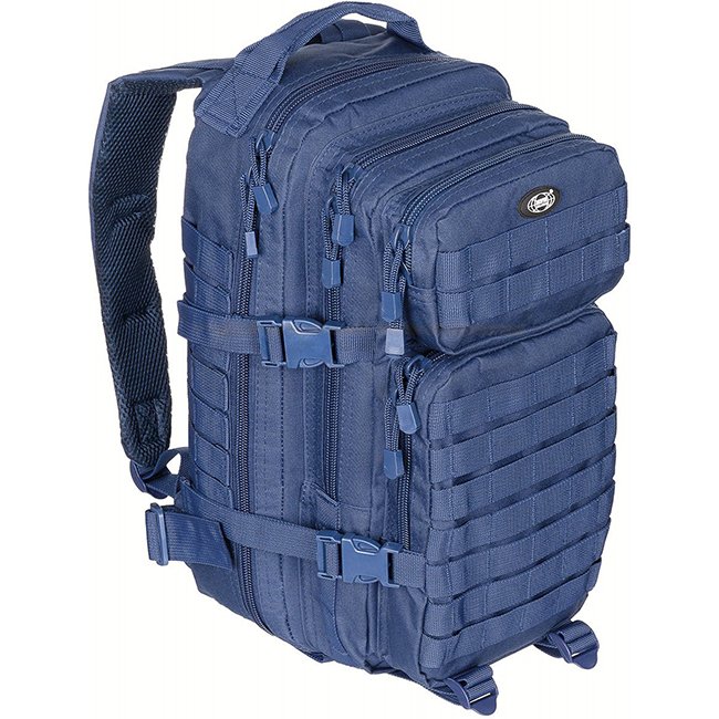MFH Rucksack Assault 1 - Blau: Verstellbare, gepolsterte Träger, abnehmbarer Hüftgurt, Fach für Trinksystem, atmungsaktive Mesh-Polsterungen, mehrere Fächer und Taschen, Molle-Befestigungsschlaufen. Kapazität: 30 l.