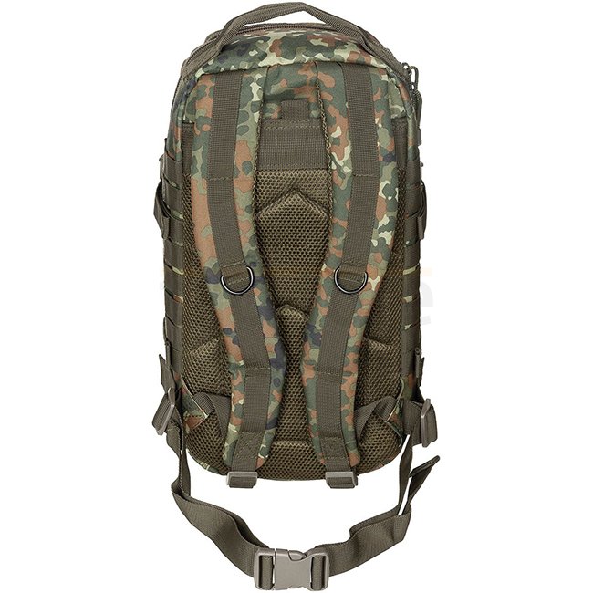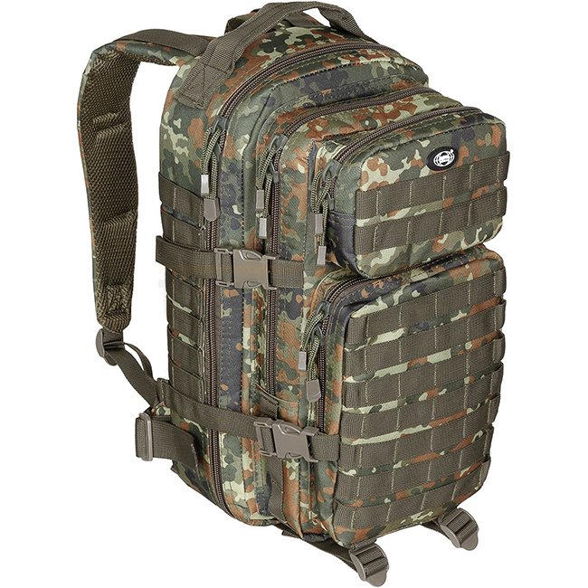 MFH Rucksack Assault 1 - Flecktarn: Verstellbare, gepolsterte Träger mit Metall-D-Ringen, abnehmbarer Hüftgurt, Fach für Trinksystem, atmungsaktive Polsterungen, mehrere Taschen, Molle-Befestigungsschlaufen. Kapazität: 30 l. Abmessungen: 23 x 44 x 24 cm (