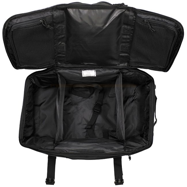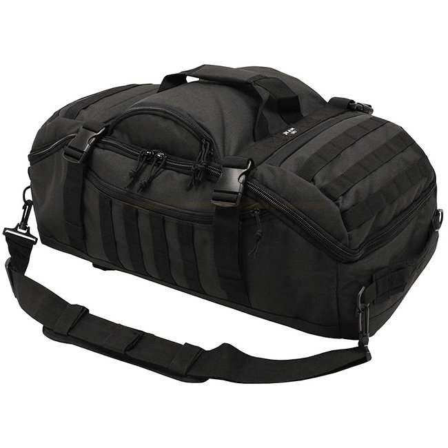 MFH Rucksack Tasche Reisen - Schwarz. Abnehmbarer, verstellbarer Schultergurt mit Polsterung. Gepolsterter Rückenteil mit Brustgurt. Tragesystem verstaubar. Griffe & Molle-Befestigungsschlaufen. Großes Hauptfach mit Trennwänden. Seitentaschen, Netztaschen
