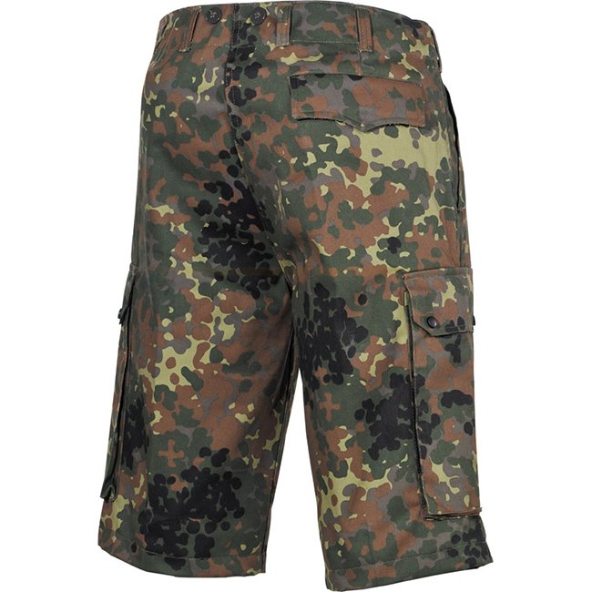 MFH BW Bermuda Shorts - Flecktarn - L. 65% Baumwolle, 35% Polyester. 2 Beintaschen mit Klappe, 2 Hosentaschen, vorderer Reißverschluss, 1 Gesäßtasche mit Knopfverschluss, Gürtelschlaufen ca. 5 cm, Trägerschlaufen außerhalb des Bundes.