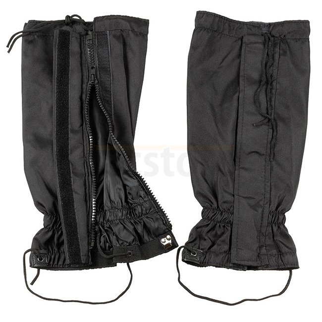 MFH BW Gamaschen - Schwarz: Versteckter Reißverschluss, Klettverschluss und verstellbarer Kordelzug für Schutz. Hergestellt aus 100% Polyester-Außenmaterial und 100% Polyurethan-Futter.