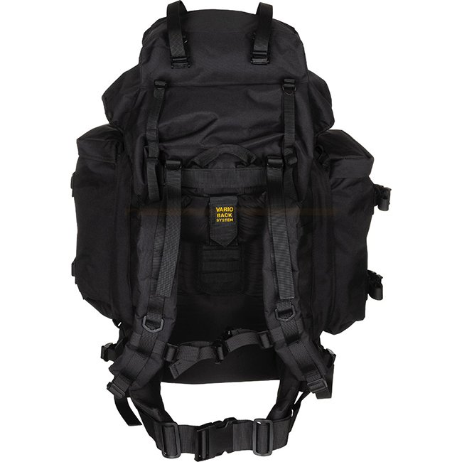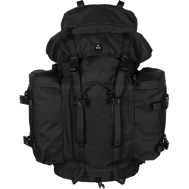 MFH BW Berg Rucksack - Schwarz: Verstellbare, gepolsterte Träger, VARIO-BACK-SYSTEM zur Höhenverstellung, Brustgurt, Aluminiumgestell, mehrere Fächer, abnehmbare Seitentaschen als Tagesrucksack, 80L Kapazität, leicht mit 2,6 kg.