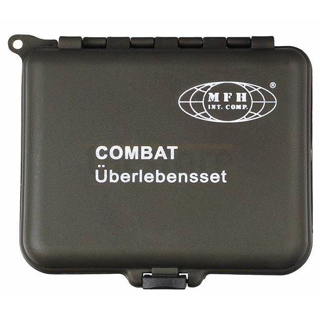 MFH Combat Survival Kit 36 Teile - Oliv: Ein komplettes Überlebenskit, das mit allen wichtigen Utensilien ausgestattet ist, wie einem Signalpfeife, Angelset, Feuerstarter, Messer, Streichhölzer und mehr, alles in einer wasserdichten Kunststoffbox mit eine