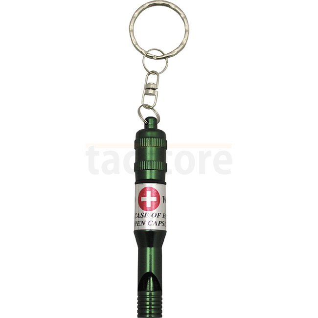 MFH Notfallpfeife - Olivgrün, kompakte und leichte Notfallpfeife mit integriertem Schlüsselanhänger und wasserdichtem Schraubverschluss zur Aufbewahrung wichtiger Notfallinformationen. Länge: ca. 9 cm, Gewicht: ca. 20 g.