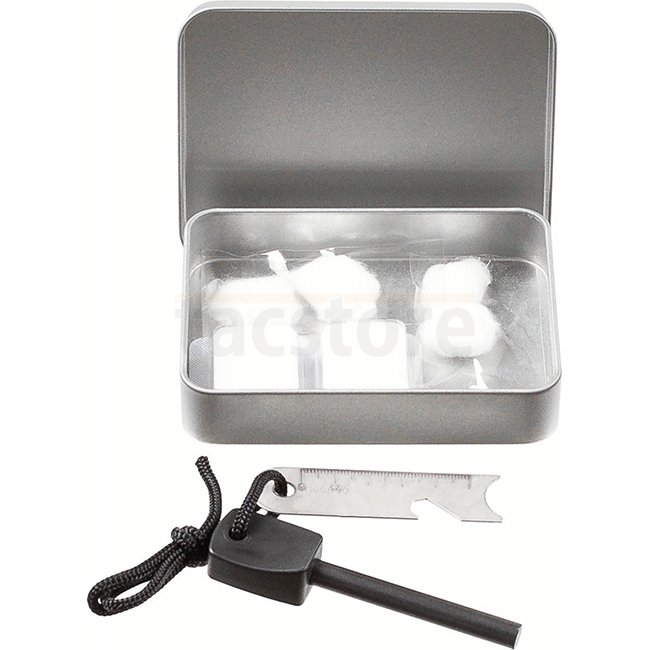 MFH Feuerstarter-Set mit Feuerstahl, Baumwollfeueranzündern, Brennstoffpellets und Metallbox. Abmessungen: 11,8 x 8,8 x 2,1 cm. Zusammensetzung des Feuerstahls: Magnesium, Eisen, Lanthan, Cer, Aluminium, Kupfer, Zink.