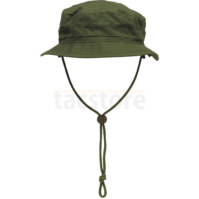 MFH GB Boonie Hut Ripstop - Olive - L: Klassischer GB Armee Boonie Hut mit mehrfach gestepptem Rand, umlaufenden Schlaufen, Kinnschnur mit Kordelstopper. Hergestellt aus 65% Polyester und 35% Baumwolle.