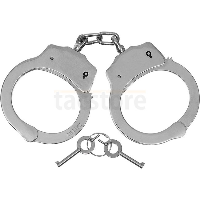 Klassische Chrom-Handschellen mit "Doppelverriegelung", zwei symmetrischen Manschetten und einer Kette mit drehbarem Lager. Aus 100% Stahl gefertigt. Länge ungefähr 23 cm.