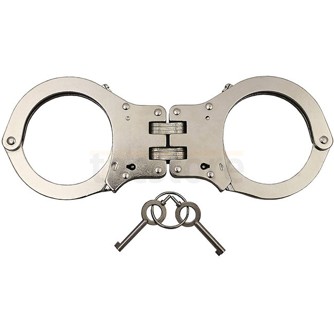 Hochwertige Handschellen mit "Doppelverriegelung". 2 symmetrische Handschellen mit Schlossnut und Scharnier. Länge: ca. 21,5 cm. Material: 100% Stahl.