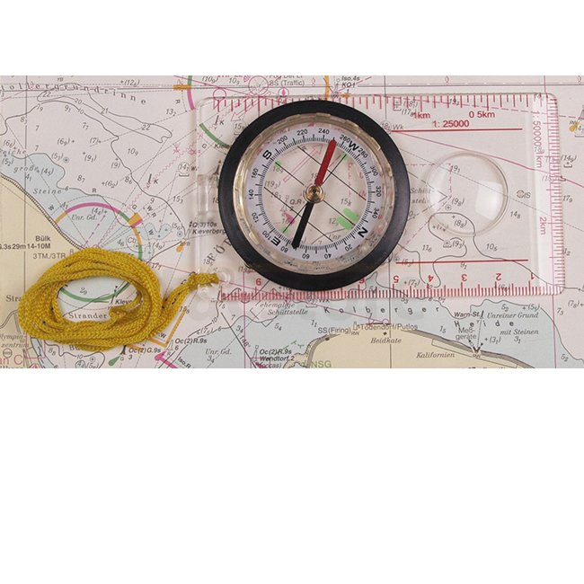 Flüssigkeitsgedämpfter, drehbarer Gehäusekompass mit 360¯ Teilung, fluoreszierenden Markierungen, Lupe, Maßstab und Trageschnur. Kompakte Abmessungen: 11 x 6 x 2 cm, leicht mit 50 g.