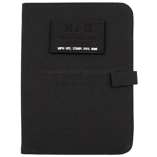 MFH-Notizbuch A5 - Schwarz: Stylisches und funktionales A5-Notizbuch mit Klettverschluss, Schubfächern, Stifthaltern und einem abnehmbaren Ringordner. Hergestellt aus strapazierfähigem 100% Polyester. Abmessungen: 24 x 17,5 x 3 cm.