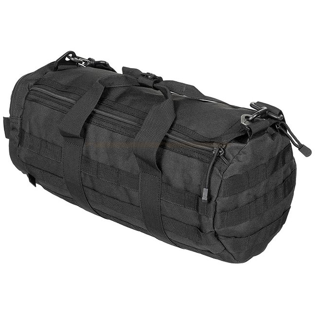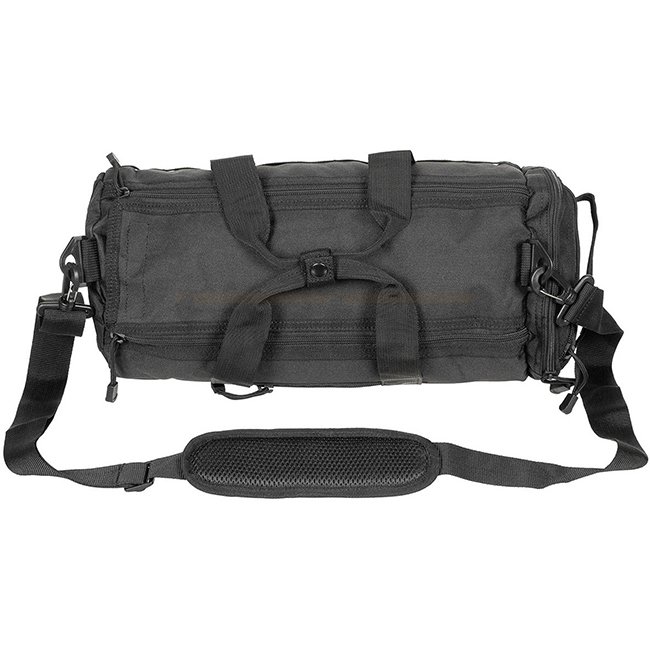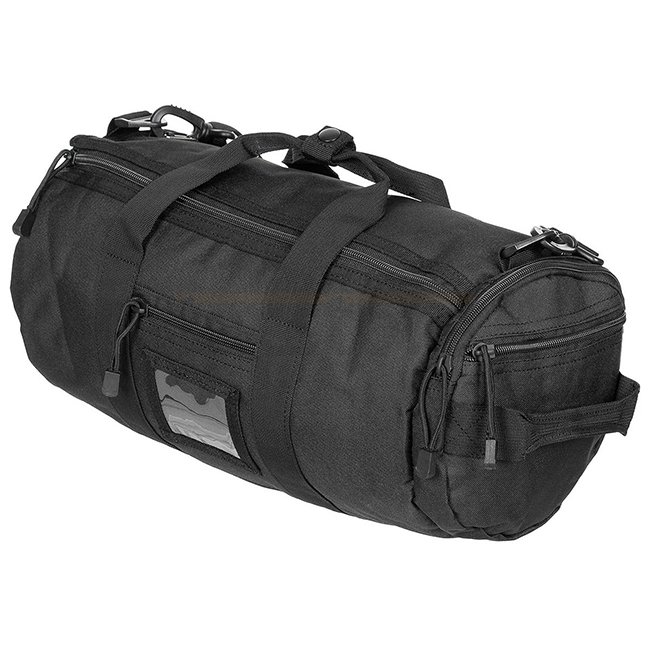 MFH Operation Bag Rund - Schwarz: Abnehmbarer, verstellbarer Schulterriemen, abnehmbares Polster, 2 Tragegriffe mit Druckknopf, Deckel mit 2-fachem Reißverschluss und Klettverschluss. Fächer umfassen 1 kleines Fach mit ID-Fenster, angebrachtes Seitenfach