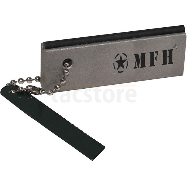 MFH Professioneller Feueranzünder: 2-teiliges Feueranzünderset mit integriertem Feuerstahl, Kette und Schaber für einfaches Feuerentfachen. Abmessungen: ca. 7,5 x 3 x 1 cm. Hergestellt aus Lanthan, Cer, Kupfer, Eisen, Zink und Magnesium.