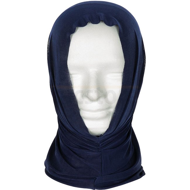 Multifunktionaler, marineblauer, runder Schal aus einer Mischung von Polyester und Elastan.