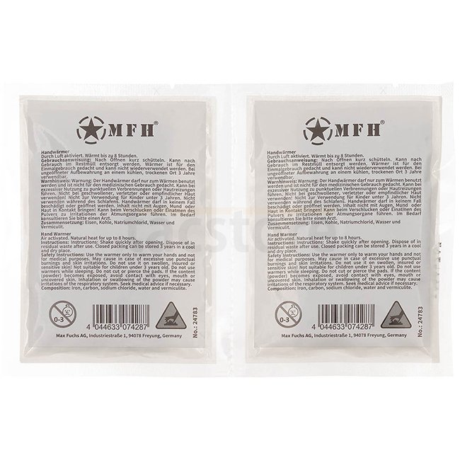 Einweg-Handwärmer, der auf ca. 68°C für ca. 8 Stunden erwärmt. Durch Sauerstoff aktiviert, kann dieses Pad nach der Benutzung im Restmüll entsorgt werden. Misst ca. 10 x 5,5 cm und wiegt etwa 60g. Enthält Eisen, Kohlenstoff, Natriumchlorid, Wasser und Ver