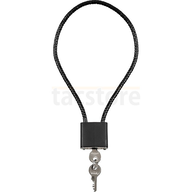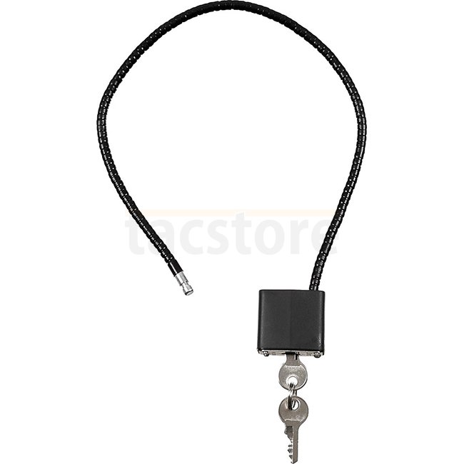 Gesicherte Feuerwaffen, Helme, Rucksäcke mit dem MFH Stahlkabelschloss in Schwarz. Universell einsetzbar für Gewehre, Flinten und Handfeuerwaffen. Stahlkabellänge von ungefähr 36 cm und ein Gewicht von etwa 140 g.