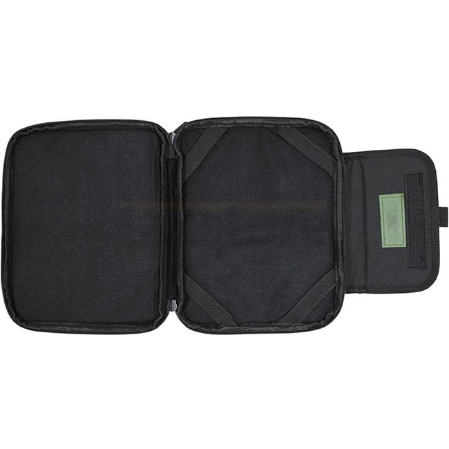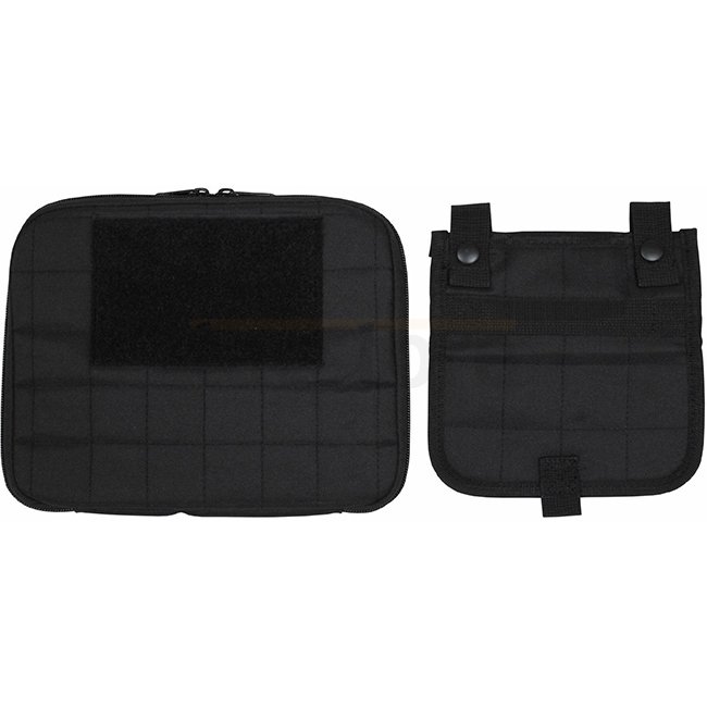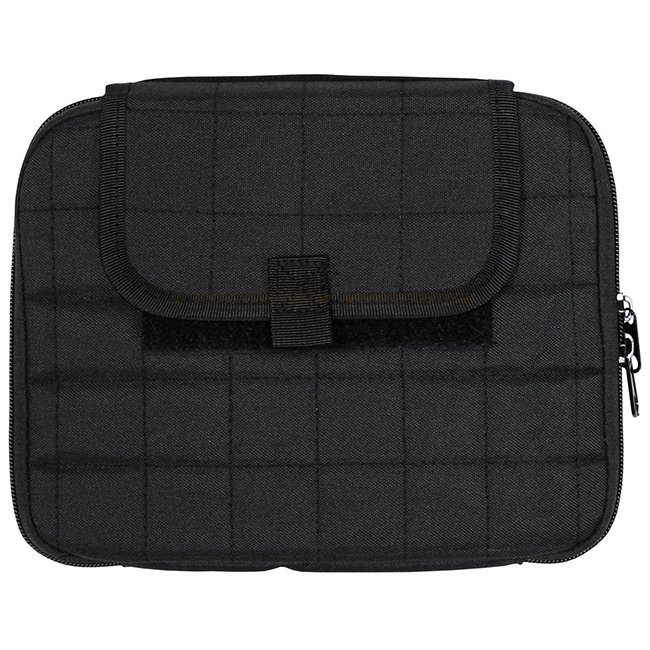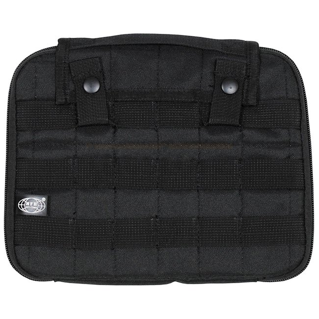 MFH Tablet-Hülle MOLLE in Schwarz. Hochwertige Hülle mit Zweifach-Reißverschluss, Klettfläche, abnehmbarer Verschlussklappe und sicheren elastischen Bändern. Maße: 25 x 20 x 2,5 cm. Hergestellt aus 100% Polyester.
