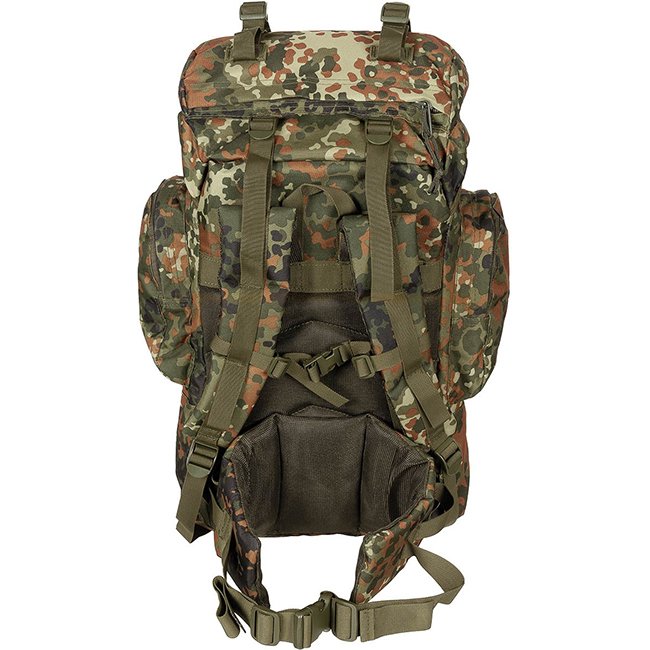MFH Taktischer Rucksack Groß - Flecktarn: Verstellbare, gepolsterte Riemen, abnehmbarer Brustgurt, Aluminiumrahmen, atmungsaktive Mesh-Polsterungen, mehrere Fächer, 55l Fassungsvermögen. Ideal für Wandern und Camping.