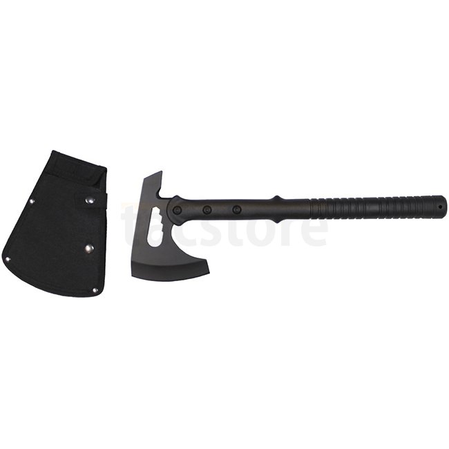 MFH Tactical Tomahawk - Schwarz: Klinge mit schwarzer Oberfläche und glatter Kante, Spitze auf einer Seite und integriertem Schraubenschlüssel in 4 Größen. Leichter Kunststoffgriff mit Befestigungsöse. Polyesterhülle mit Druckknöpfen, Klettverschluss und