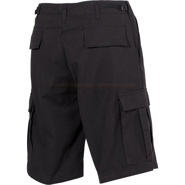 MFH US Bermuda Shorts Ripstop in Schwarz, XL. Knopfverschluss, 6 geräumige Taschen, verstellbarer Bund und breite Gürtelschlaufen. Hergestellt aus 100% Baumwolle.