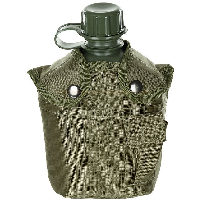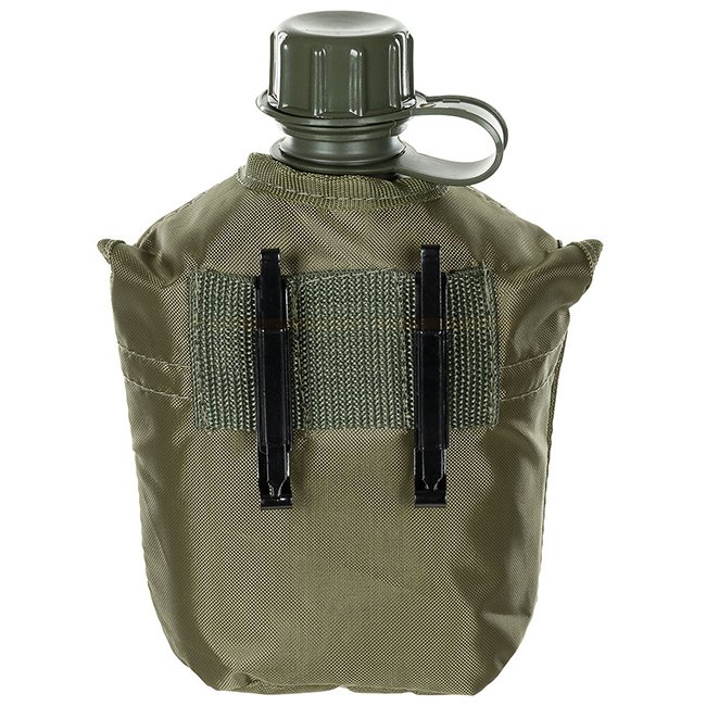 MFH US Feldflasche & Abdeckung 1 l - Oliv. Praktische Feldflasche mit Schraubverschluss und gepolsterter Abdeckung. Verfügt über eine Außentasche, Halteclips und strapazierfähige Materialien. Abmessungen: 13 x 21 x 8 cm, Gewicht: 200 g.