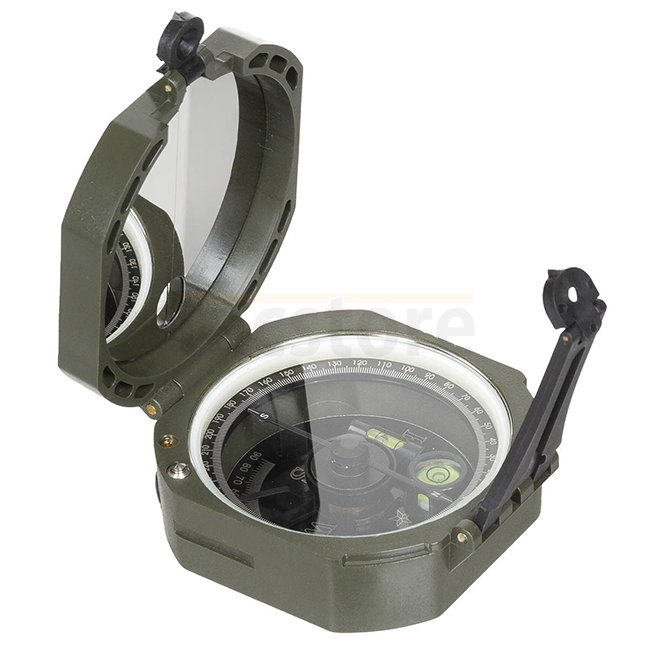 MFH US Kompass M2 - Geologischer Kompass mit Spiegel, 360¯ Graduierung, fluoreszierenden Markierungen, 2 Wasserwaagen zur Ausrichtung, Klinometer, Perlenvisiere, magnetische Nadelarretierung. Deckel mit Spiegel, Zielbohrung und Karte. Abmessungen: 7,