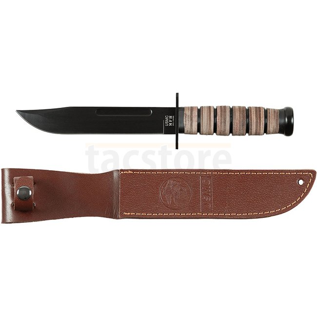 MFH USMC Kampfmesser in Braun mit geschwärzter Klinge, metallener Parierstange, Ledergriffringen und "USMC"-Prägung.