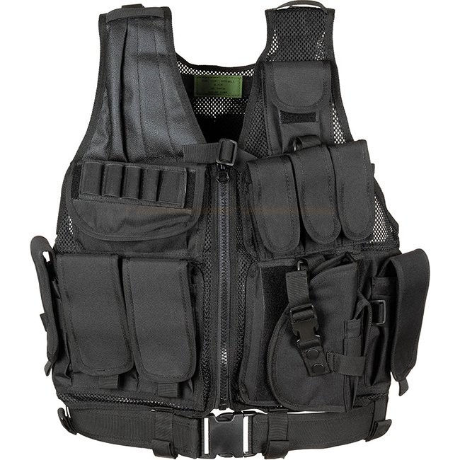 MFH USMC Weste & Gürtel - Schwarz: Basis aus Mesh-Material, größenverstellbar, mehrere Taschen, abnehmbare Taschen, Molle-Befestigungsschlaufen, Holster mit Munitionstasche, Kunststoffgürtelverschluss. 100% Polyester.
