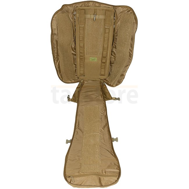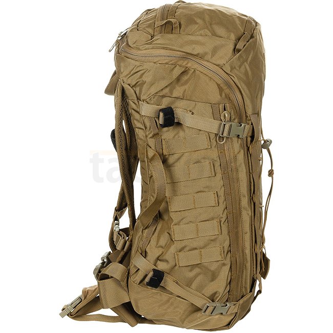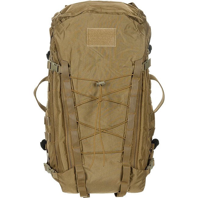 Verstellbare, gepolsterte Tragegurte mit Schlaufen verstellbare Brust- und Beckengurte 1 Tragegriff oben und jeweils seitlich Klettflauschpatch ca. 8 x 5 cm vorne oben Deckeltasche mit RV und Karabinerhaken innen komplett aufklappbares Hauptfach mit 2-Wege RV, RV-Tasche, Rückenplatte mit seitlichen Molle-Aufnahmeschlaufen, Karabinerhaken und 2 herausnehmbaren Alustützen 3 längliche Klettflauschpatches innen: 1 x ca. 45 x 9,5 cm, 2 x ca. 47 x 9,5 cm zum Befestigen von optionalen Taschen (Art.Nr.: 30305, 30306, 30307, 30308) 2 verdeckte Schlauchdurchführungen oben Front mit elastischem Kordelzug mit Stopper und seitlich verlaufenden Molle-Aufnahmeschlaufen 2 Seitentaschen mit Reissverschluss, je 2 Kompressionsriemen, Molle-Aufnahmeschlaufen und Schlauchdurchführung oben Fassungsvermögen: ca. 30 l Masse: ca. 30 x 55 x 25 cm (B x H x T) Gewicht: ca. 1,5 kg