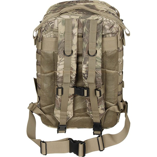 MFHHighDefence US Rucksack Assault 2 - Snake FG bietet Komfort und Organisation für Ihre Outdoor-Abenteuer. Verstellbare gepolsterte Schultergurte, abnehmbare Brust- und Hüftgurte sowie ein gepolsterter Rückenteil aus atmungsaktivem Mesh gewährleisten ein
