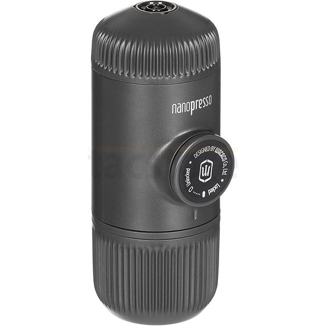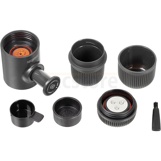 NanoPresso Espressomaschine - Grau: Tragbare Espressomaschine, manuelle Bedienung, kompaktes Design, einfach zu bedienen und zu reinigen. Enthält Wassertank, Pumpe, Siebträger, Filtersieb, Löffel und Reinigungsbürste. Abmessungen: 16 x 7 cm, Gewicht: 340