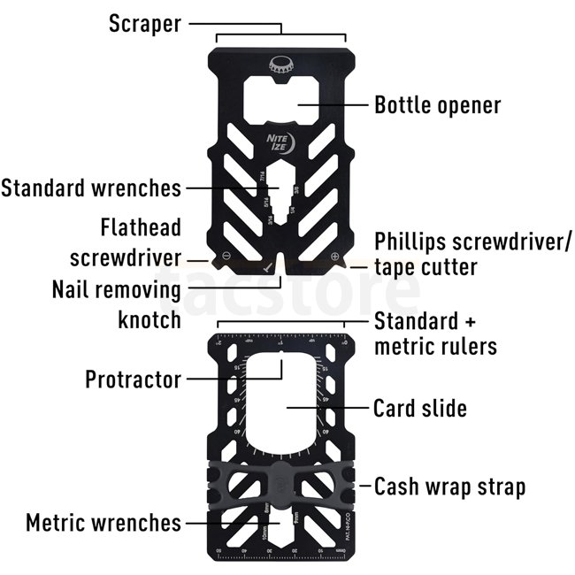 • Enthält: Cash Wrap Strap, Flaschenöffner, 5 Schraubenschlüssel in Standardgröße, 6 Schraubenschlüssel in metrischer Größe, Kerbe zum Nagelziehen, Kreuzschlitzschraubendreher, Schlitzschraubendreher, Schaber, metrische und Standardlineale und Winkelmesser