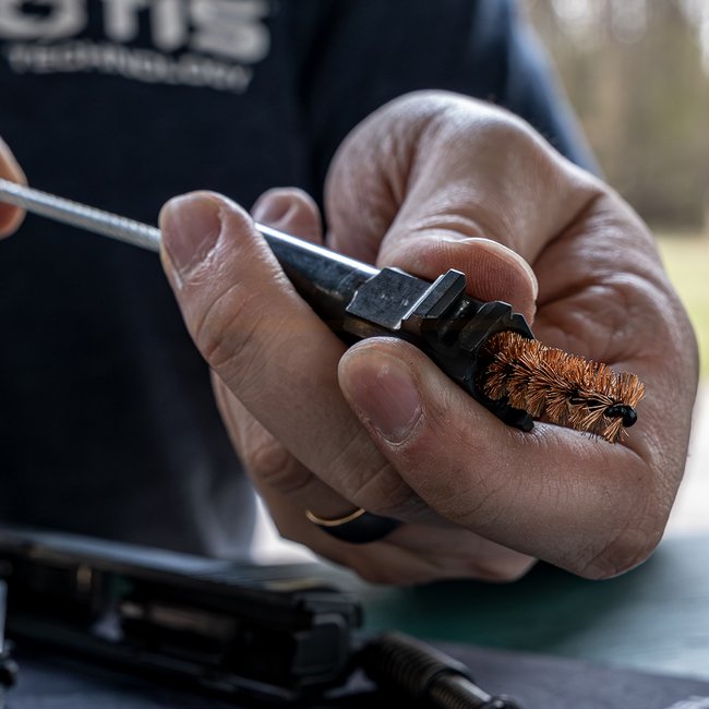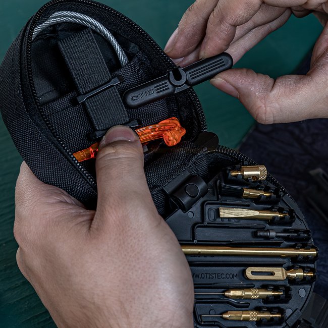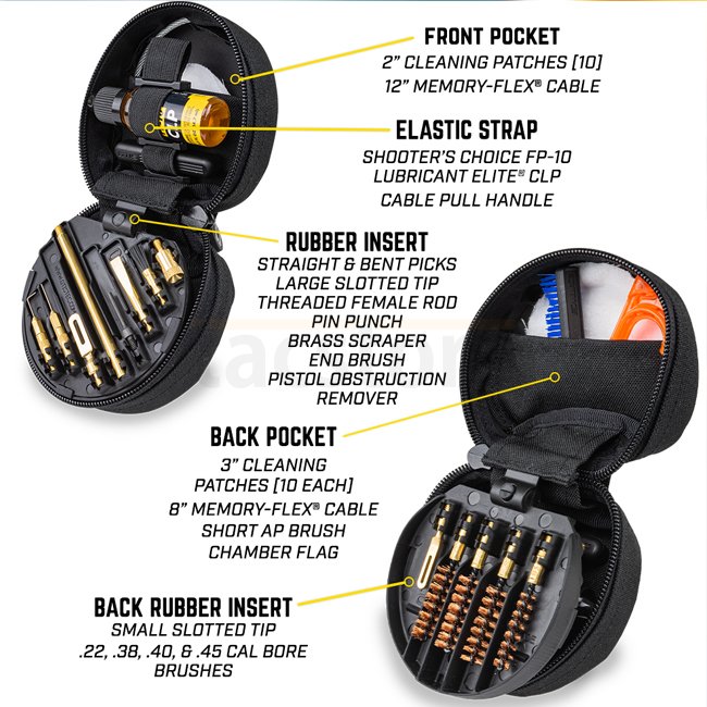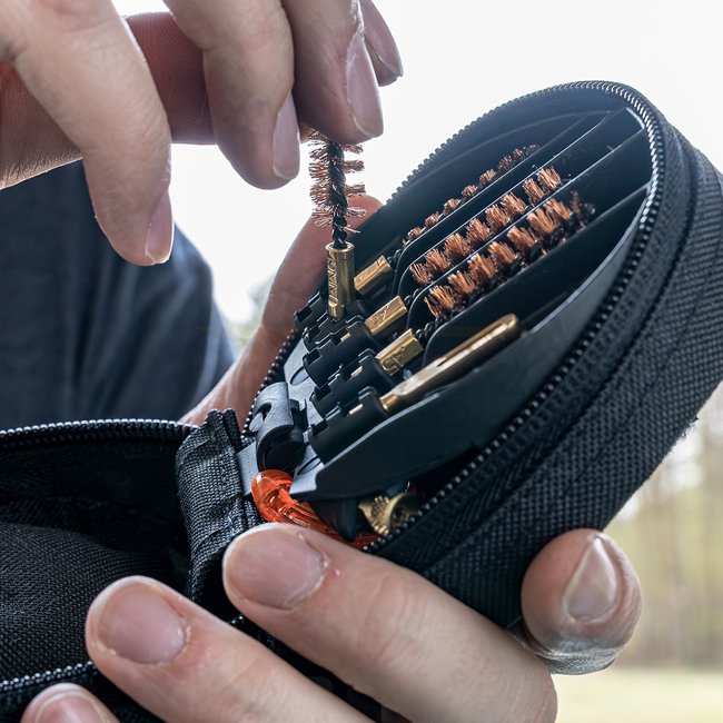 Reinigungsset für Pistolen und Maschinenpistolen im Kaliber .45, verstaut in einem leichten, kompakten Softpack-Case mit den Maßen 10 x 10 x 6cm. Hergestellt in den USA.