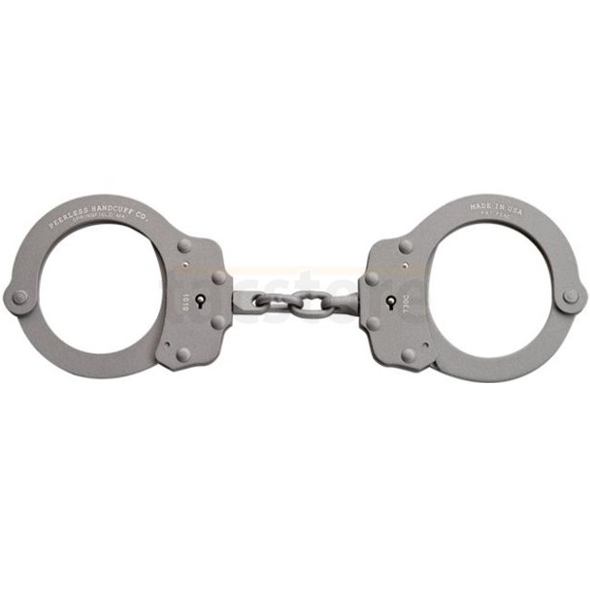 Leichtgewichtige Peerless Model 730C Superlite Kettenglied-Handschellen in grauer Farbe, nur 141g schwer, entworfen für die Strafverfolgung mit Komponenten aus Luftfahrt-Aluminium, Kohlenstoffstahl und Edelstahl. Verfügt über 21 Sperrpositionen, Druckstif