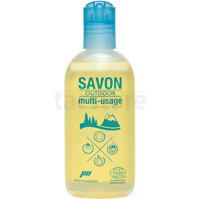 PharmaVoyage Bio Outdoor Seife 100 ml - Biologisch abbaubare Universalseife, geeignet für Körper, Haar, Kleidung und Geschirr. Enthält Aqua, Kaliumpalmkernalat, Cellulosegummi, Glycerin und ätherisches Lavendelöl. Ideal für den Außenbereich, biologische I