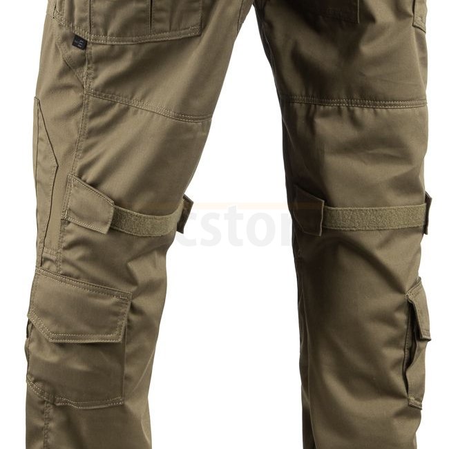 Die bewusst zur Front hin platzierten Oberschenkeltaschen, welche dank grosser Öffnungen sowie vertikaler Reissverschlüsse auch in sitzender Position zugänglich sind, sowie direkt daneben platzierte, doppelt verstärkte Kommunikationstaschen, nehmen oft verwendete Ausrüstung auf. Die Haupttaschen können zudem mit einem grossen Knopf, mit Klett oder auch beidem gleichzeitig verschlossen werden. Die angewinkelten Gesässtaschen bleiben auch dann zugänglich, wenn Ausrüstung an einem breiten Einsatzgurt getragen wird.
