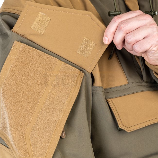 Die große Kapuze ist in Höhe und Umfang verstellbar. Große, robuste geschlitzte Knöpfe auf der Vorderseite ermöglichen das Schließen und Öffnen des AKROG auch mit Handschuhen. Die zwei Haken & Flausch Flächen auf den Oberarmen sind vertikal getrennt, wodurch das Flauschmaterial ergonomisch um den Oberarm gelegt werden kann.