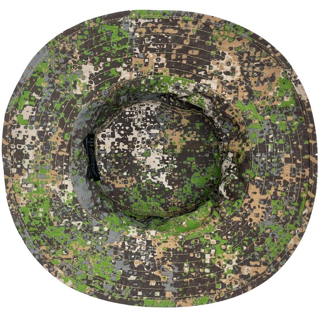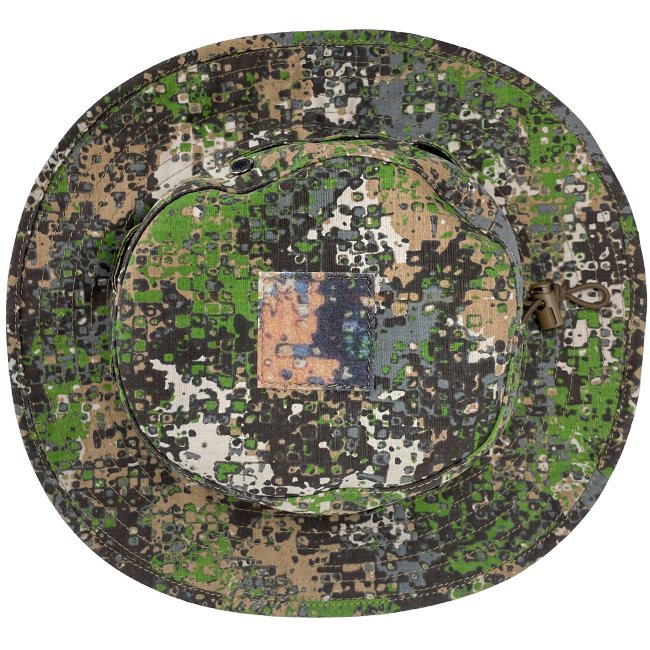 Während die klassische Form eines Boonie-Hutes beibehalten wird, ist die Oberseite etwas abfallend und misst 40mm an der Vorderseite und 50mm auf der Rückseite. Im oberen Bereich findet sich eine 50 x 50mm große Klettoberfläche zum Anbringen eines IR-reflektierenden Patches. An den Seiten befinden sich Ösen für die Luftzirkulation: Klein genug um Regen abzuhalten, gross genug um eine Grundlüftung zu gewährleisten. Um den Hut herum haben wir das gleiche Material aus Polyester-Baumwolle anstelle von steifem Gurtband verwendet. Verdeckt rund um den Umfang ist eine elastische Schnur eingenäht, die eine stufenlose Anpassung der Grösse für einen perfekten Sitz ermöglicht. Die gewählte Grösse wird durch einen Stopper im hinteren Bereich beibehalten. Die Krempe ist etwas weniger breit als üblich. Genau perfekt wie wir finden. Alle anderen Funktionen der Standardmodelle, wie der Kinnriemen oder die Nackenabdeckung, wurden weggelassen. Funktionalität durch Einfachheit.