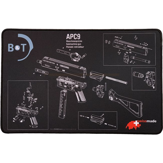 Hochwertige Premium-Tischmatte für die Waffenwartung oder als Oberflächenschutz. Kompakt 43cm x 28cm mit 3mm Dicke. Detaillierte Explosionszeichnungen von Waffenkomponenten. Offizielles B&T-Logo mit Genehmigung von B&T Thun AG Schweiz.