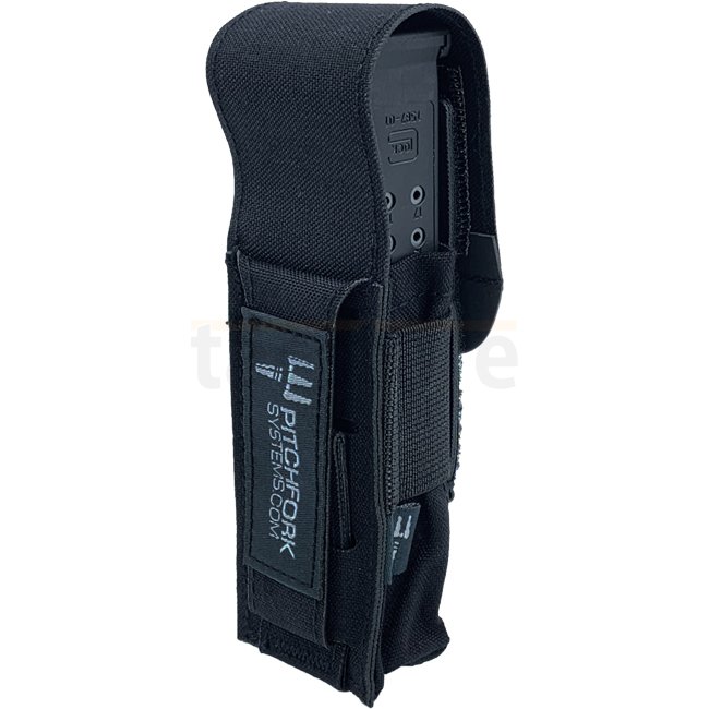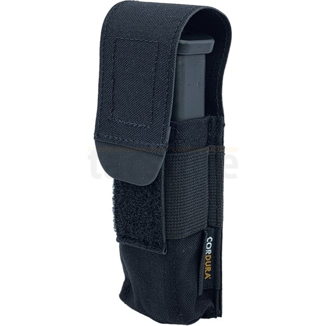 Die Closed Single Pistol Magazine Pouch nimmt alle gängigen zweireihigen Pistolen Magazine auf, auch breitere .45 Cal. Magazine passen. Einreihige Single-Stack Magazine passen grundsätzlich ebenfalls, sitzen jedoch nicht satt. Für einen besseren Halt des Magazins findet sich rund um die Tasche ein elastisches Zugband. Das aus hoch-widerstandsfähigem sowie leicht elastischem Hypalon gefertigte Ende der Lasche vereinfacht das Öffnen, dies selbst mit Handschuhen.