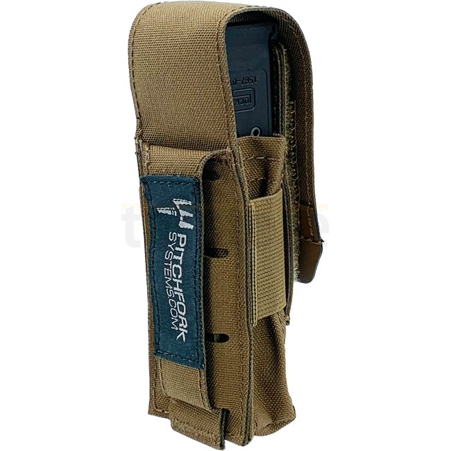 Pitchfork Geschlossene Einzelmagazintasche für Pistolen - Coyote: Für verschiedene Pistolenmagazine geeignet, einschließlich breiterer .45 cal. und doppelt gestapelter Typen. Verfügt über ein elastisches Band für besseren Halt und Hypalon-Endlasche für ei