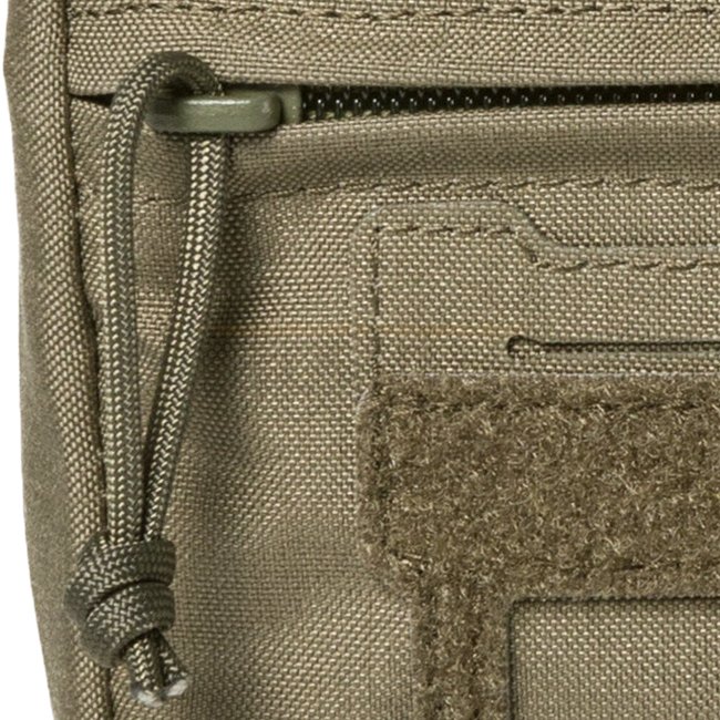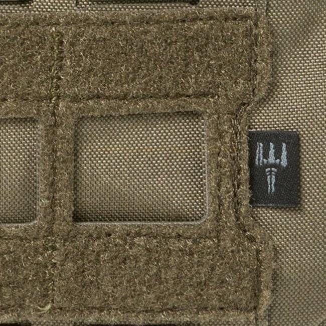 Die Fronttasche weist auf der Innenseite Klett auf, damit zusätzliches Zubehör wie ein Organizer für Kleinmaterial oder ein Holster installiert werden kann. Die Laser-Cut MOLLE Schlaufen auf der Front dienen der Montage von zusätzlichen Taschen, was vor allem dann interessant ist, wenn die Drop Fanny Protector Pouch nicht zugänglich ist, etwa aufgrund von herausstehenden Magazintaschen am Plattenträger. Die MOLLE Schlaufen weisen aber auch eine Klett-Oberfläche für die Montage von Erkennungs-Patches auf. Da die mittleren Stege zudem nicht mit der Tasche vernäht sind, können auch Tourniquet Halter sicher eingeschlauft werden.