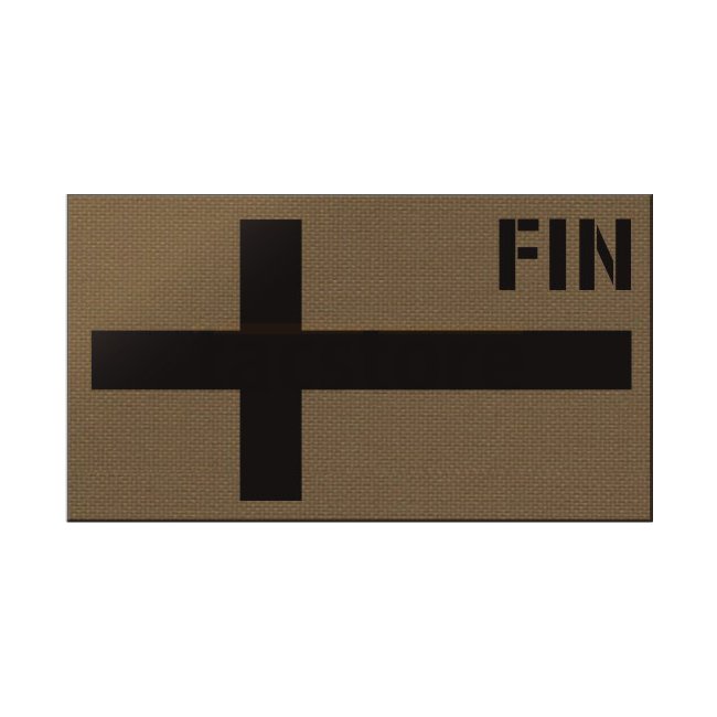 Ein koyotenfarbener Pitchfork Finland IR Druckaufnäher mit einem 90x50 mm Design und IR-Folie auf der Vorderseite sowie einer Hakenfläche auf der Rückseite.